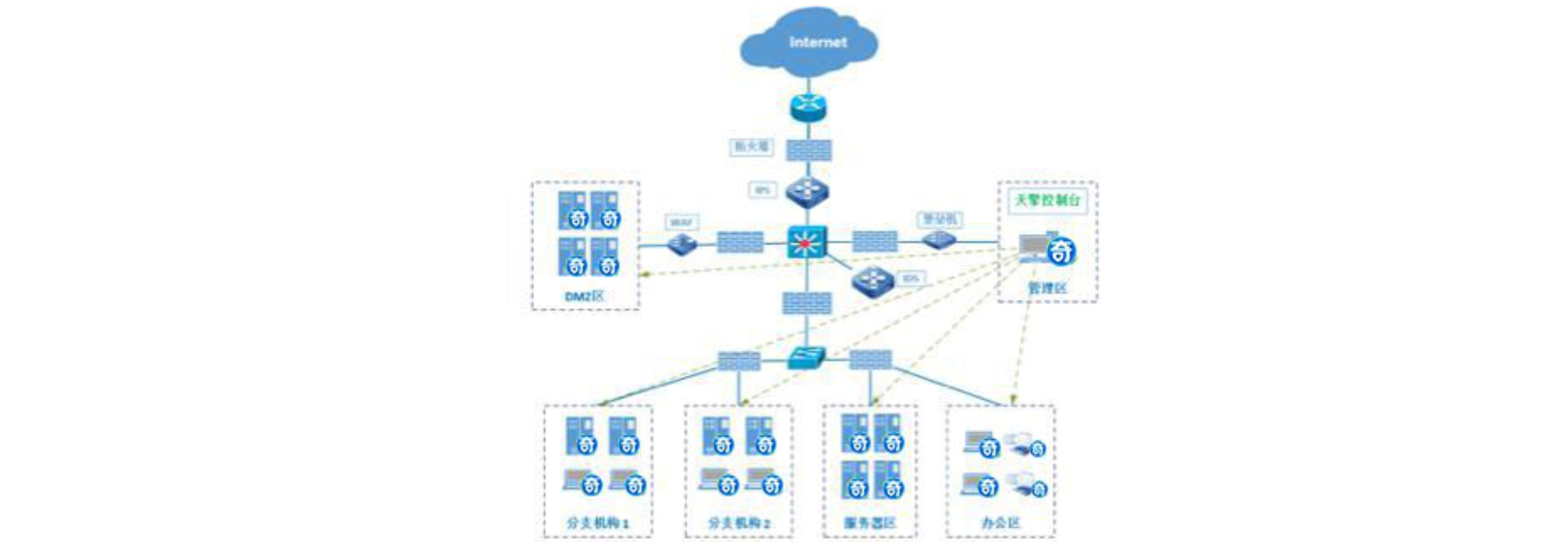 - 企業(yè)通過總部天擎終端安全管理中心對總部和分支機構(gòu)終端設(shè)置強管控安全策略,分支機構(gòu)在總部安全策略基礎(chǔ)上按需調(diào)整安全管控力度。在內(nèi)網(wǎng)部署私有云引擎,在不訪問外部互聯(lián)網(wǎng)情況下實現(xiàn)終端病毒云查殺。通過部署NAC網(wǎng)絡(luò)準(zhǔn)入設(shè)備,阻止未授權(quán)設(shè)備接入內(nèi)網(wǎng)和訪問敏感資源,保證內(nèi)網(wǎng)接入安全的同時也提高安全管理軟件的安裝率。
