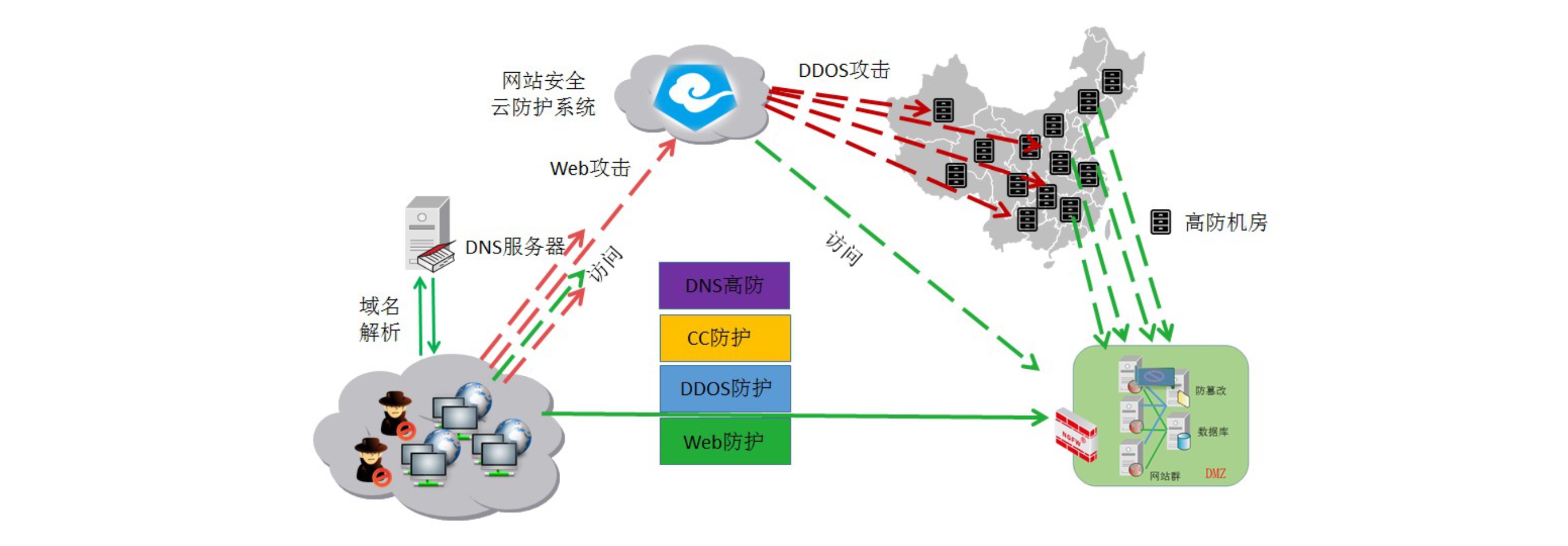 而在針對大流量攻擊上網(wǎng)站云防護(hù)系統(tǒng)可以通過自身的負(fù)載均衡系統(tǒng)將大流量的DDOS分發(fā)到全國各地的高防機(jī)房進(jìn)行清洗,清洗完成再講流量回注給后端的網(wǎng)站服務(wù)器,徹底解決了網(wǎng)站所面臨的大流量DDOS攻擊和CC攻擊的威脅。
