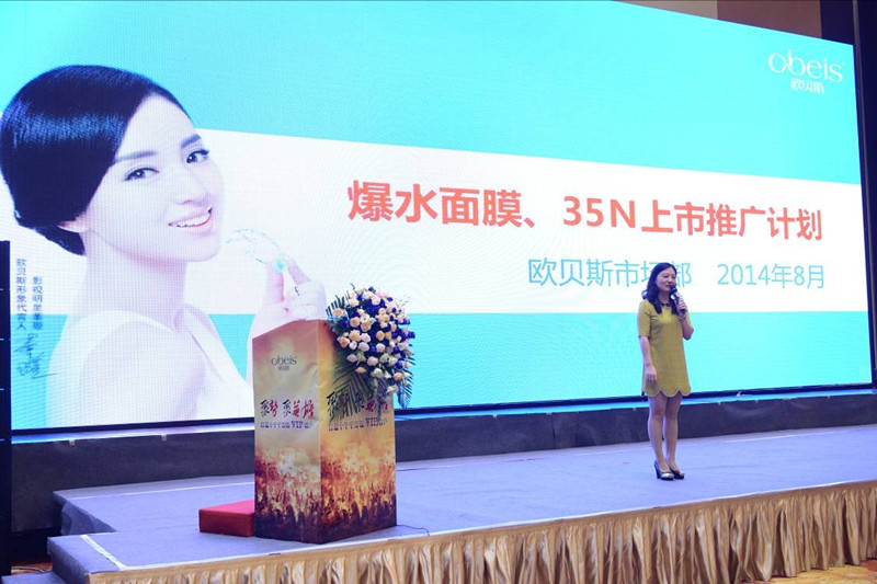 歐貝斯市場(chǎng)部總監(jiān)李紅梅女士為與會(huì)嘉賓講解2014歐貝斯新品——千萬級(jí)明星單品“爆水面膜”(即海藍(lán)深潤(rùn)保濕精華面膜)與35°N精純橄欖尊寵養(yǎng)護(hù)系列產(chǎn)品的上市推廣計(jì)劃。歐貝斯聚焦打造的爆水面膜,以精美的包裝,優(yōu)良的品質(zhì),大力度的渠道讓利,豐富的陳列道具和促銷贈(zèng)品,以及100%中獎(jiǎng)、最高可獲澳洲大堡礁深海探秘之旅的終端拉動(dòng)活動(dòng),既展示了歐貝斯對(duì)打造明星爆品的決心,又實(shí)實(shí)在在地向市場(chǎng)傳遞了強(qiáng)勁的動(dòng)銷力。
